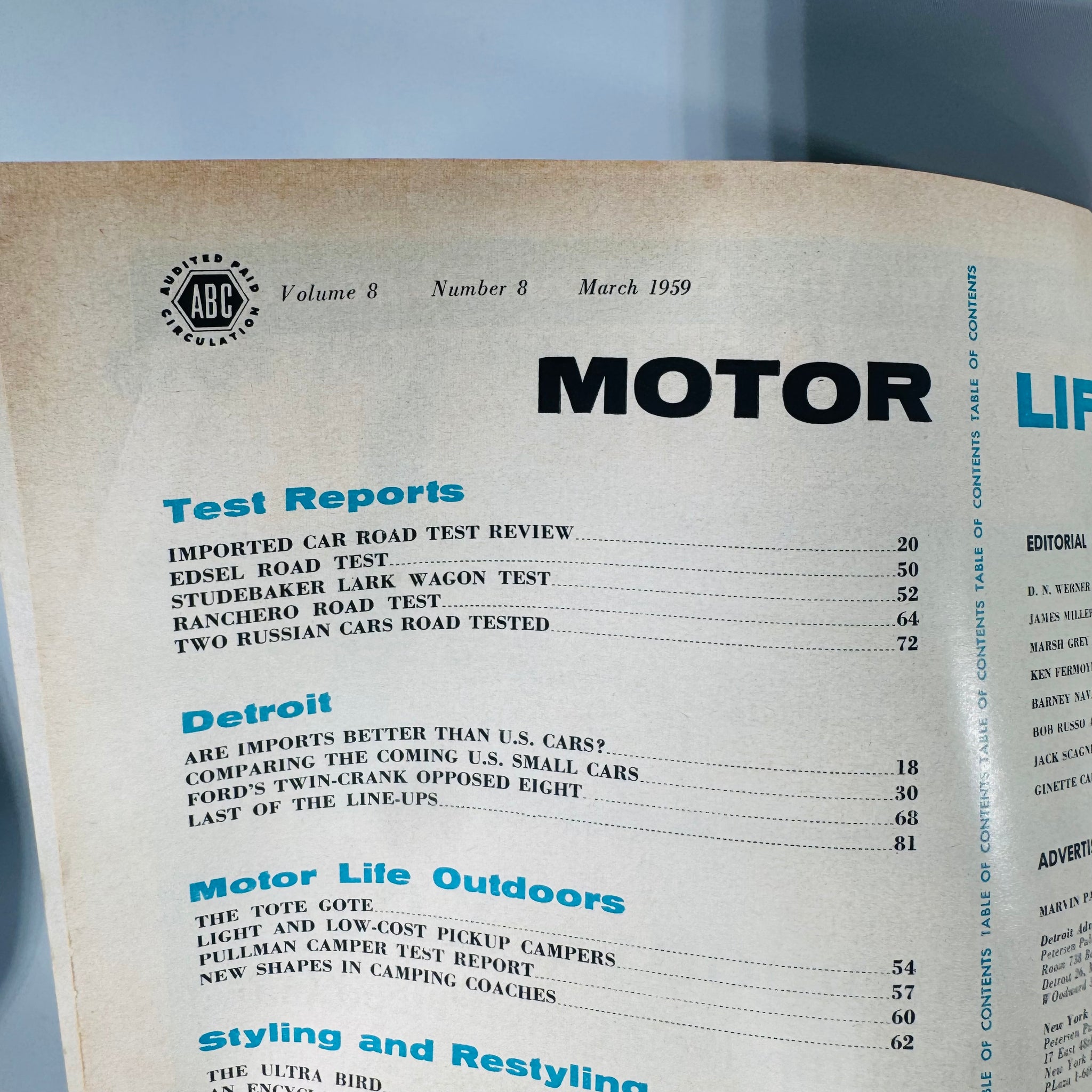 Issue details: Volume 8, Number 8, March 1959 (visible on contents spread)