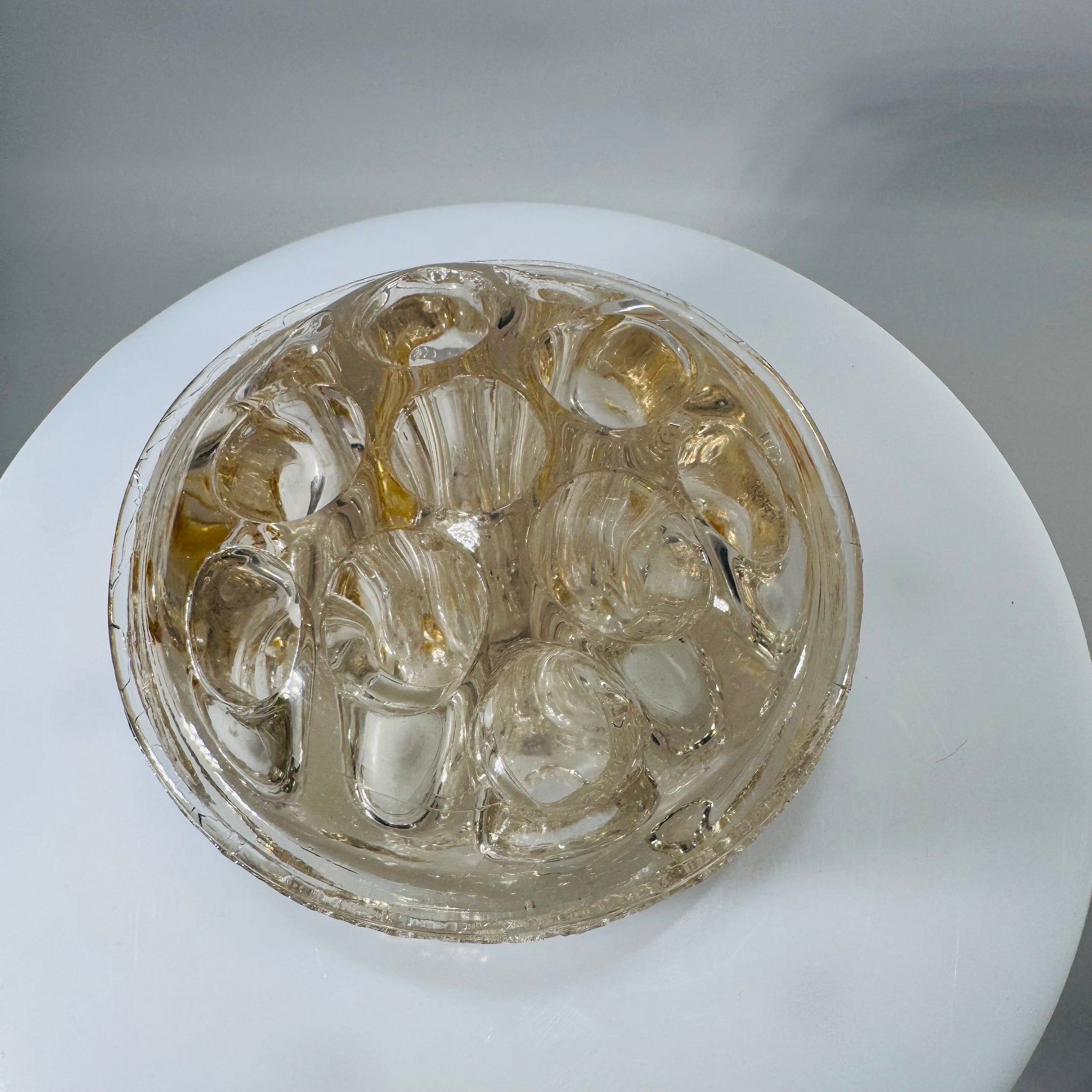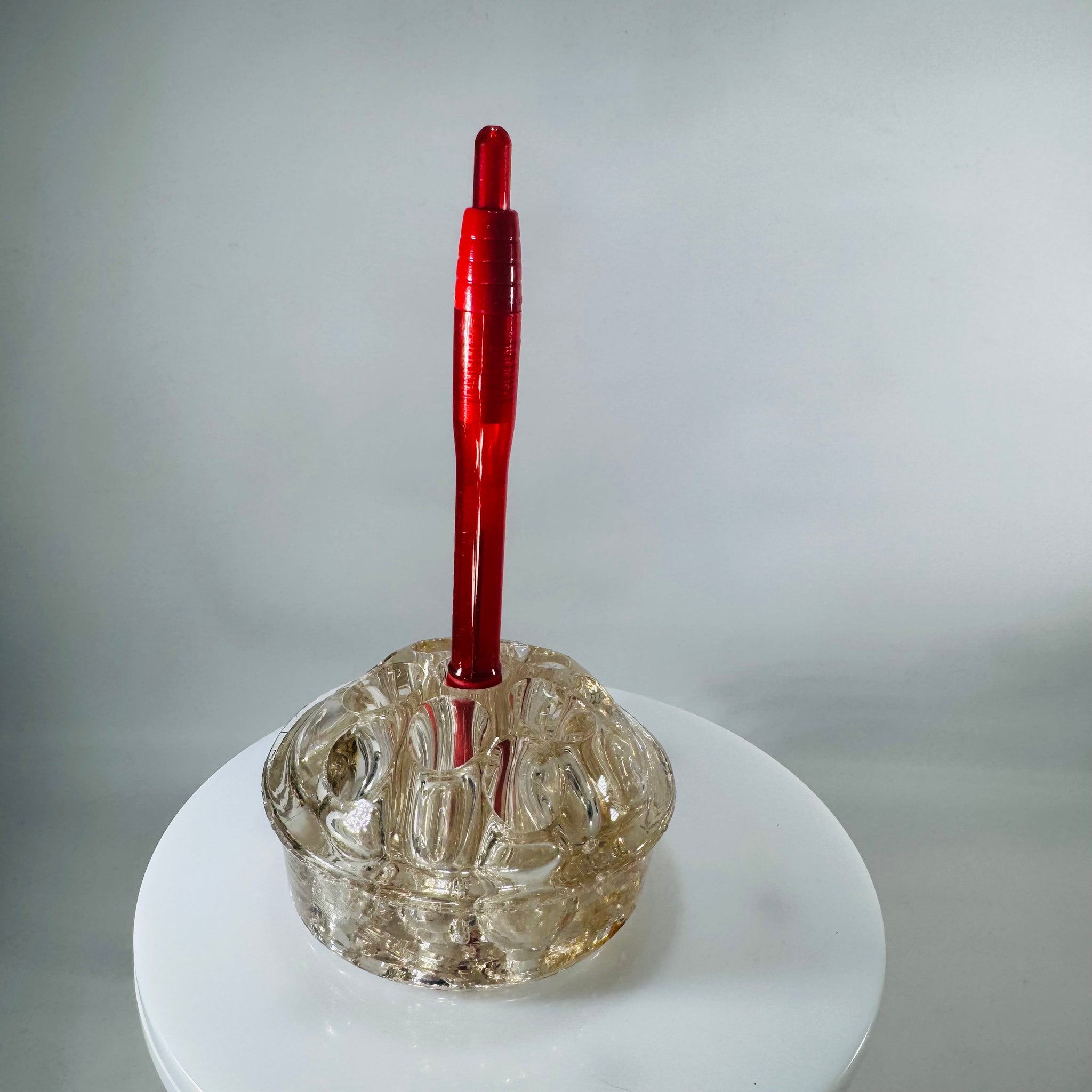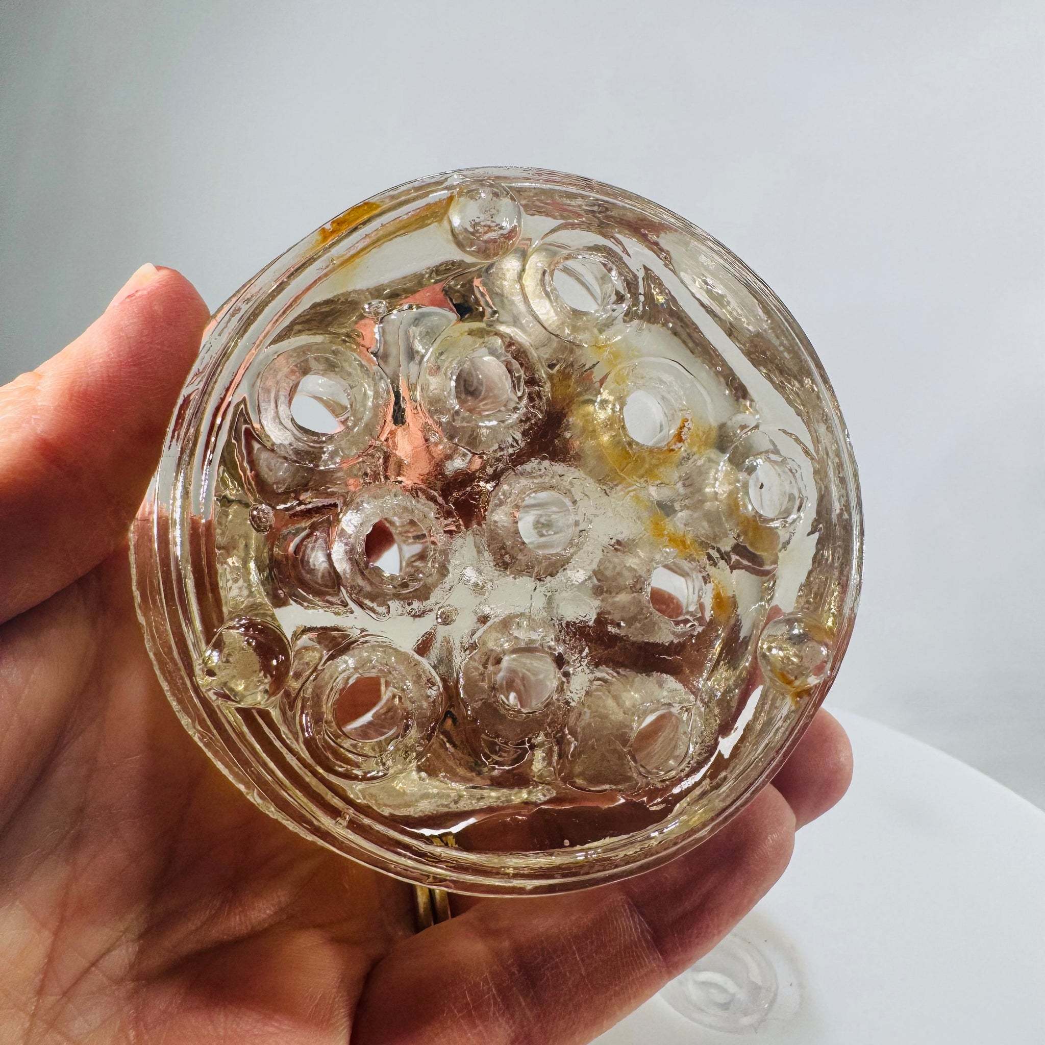 A small, heavy vintage classic that makes arranging flowers genuinely easy. This amber-tinted pressed glass flower frog is 3" round and weighs about 10 oz.