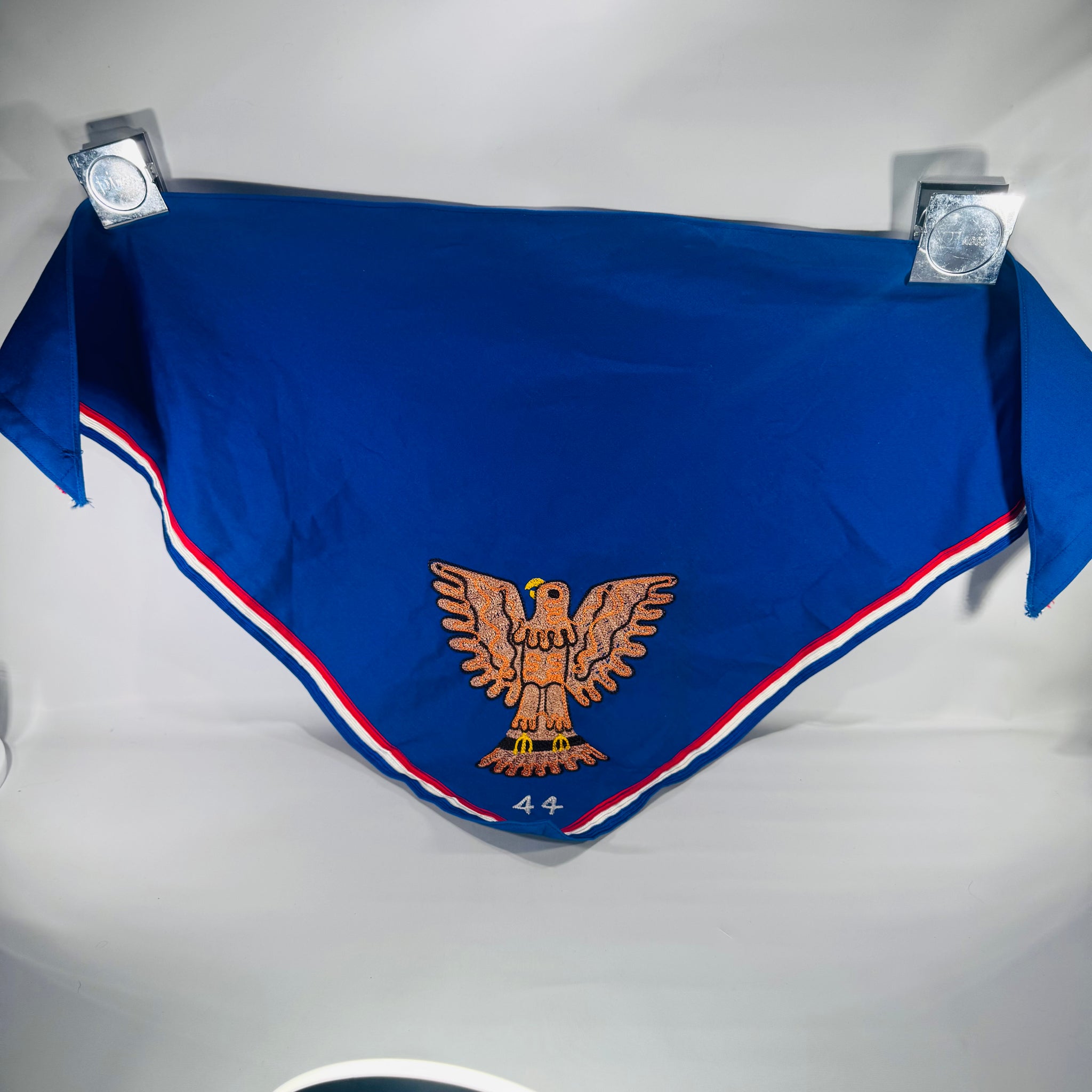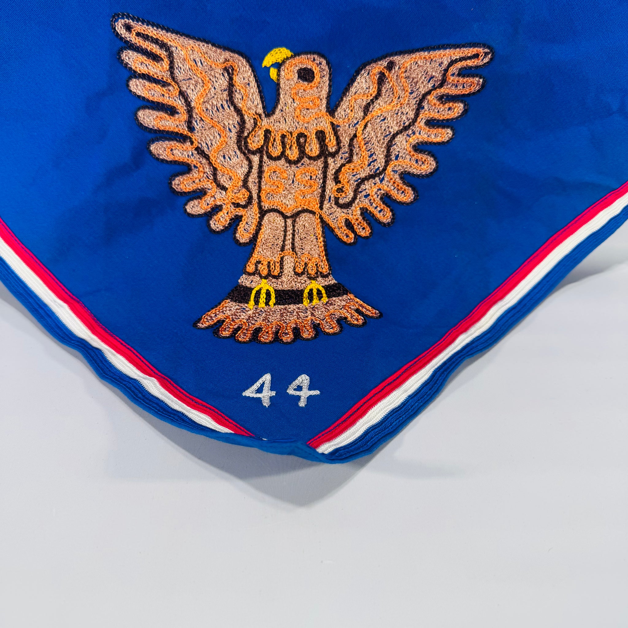 A classic Boy Scouts of America Eagle Scout neckerchief in bright blue with a bold embroidered eagle and red/white edging—an iconic piece of Scout history and a standout display collectible.