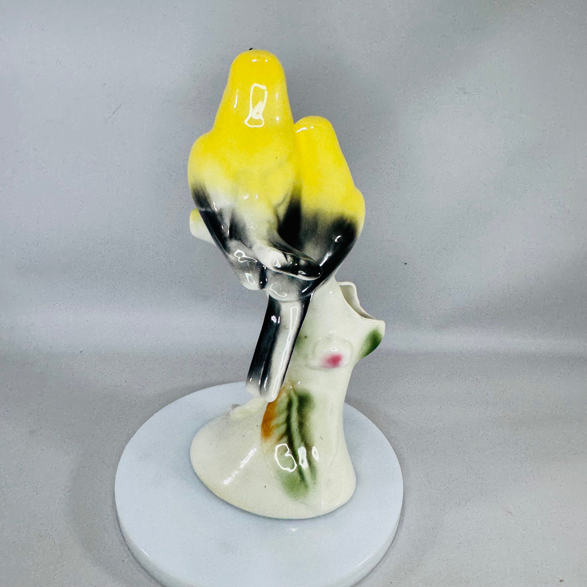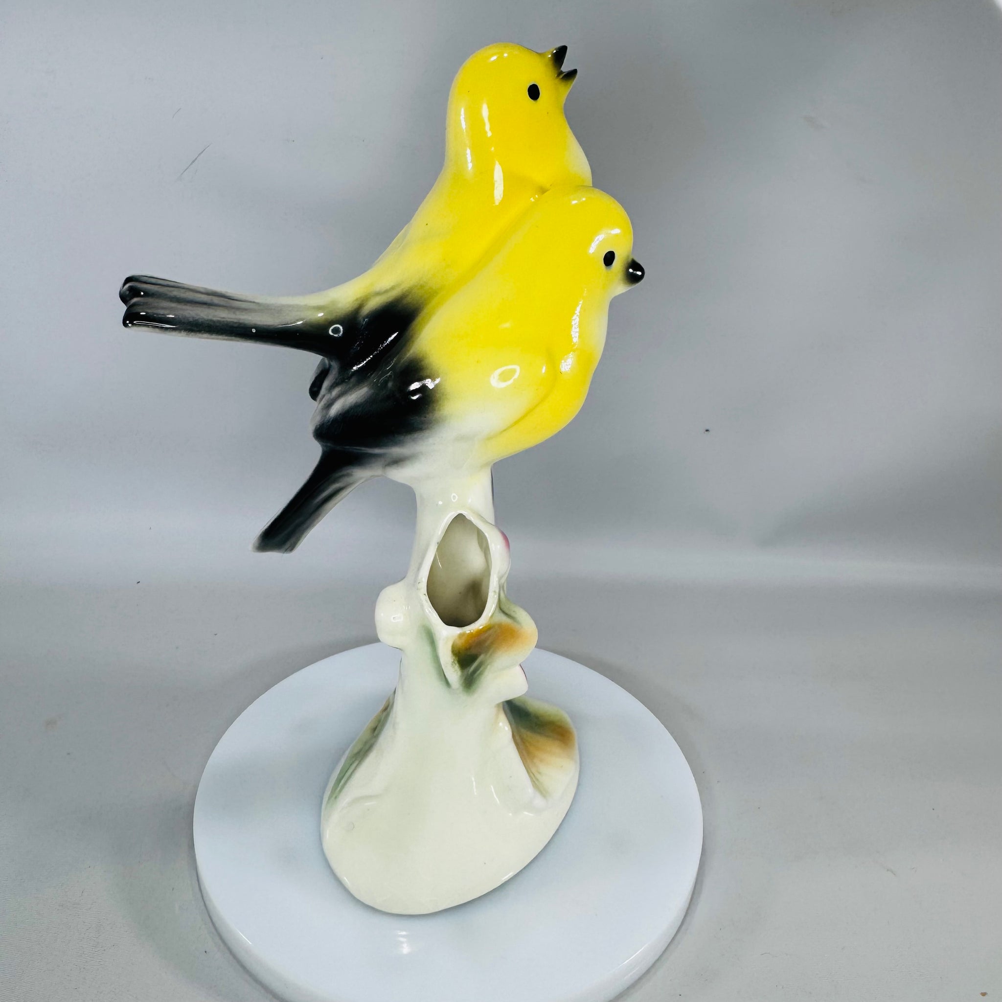 Cheerful vintage Clay Sketches bud vase—two sunny yellow birds on a branch with a pink flower. Pasadena, CA charm in a sweet 8.5” size.