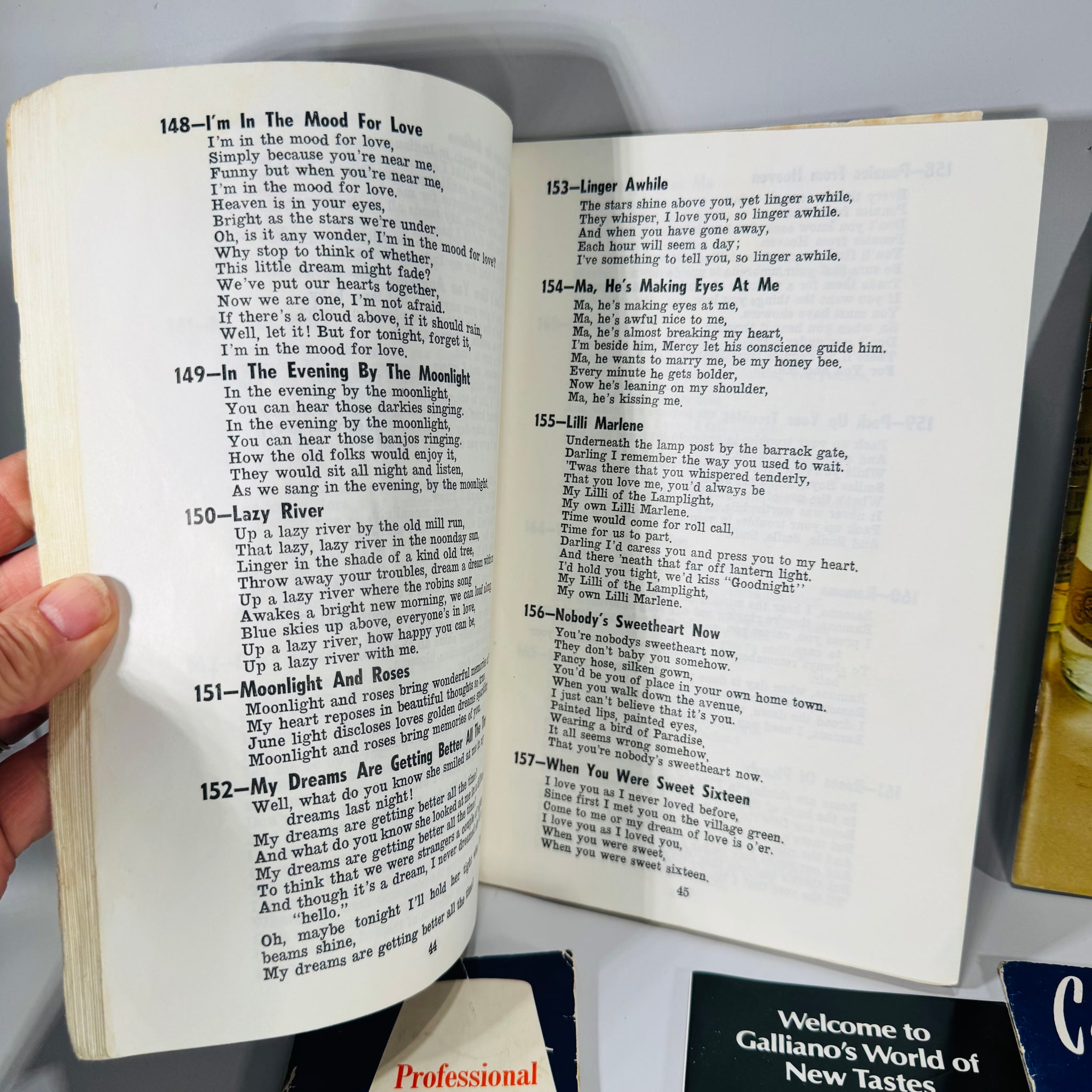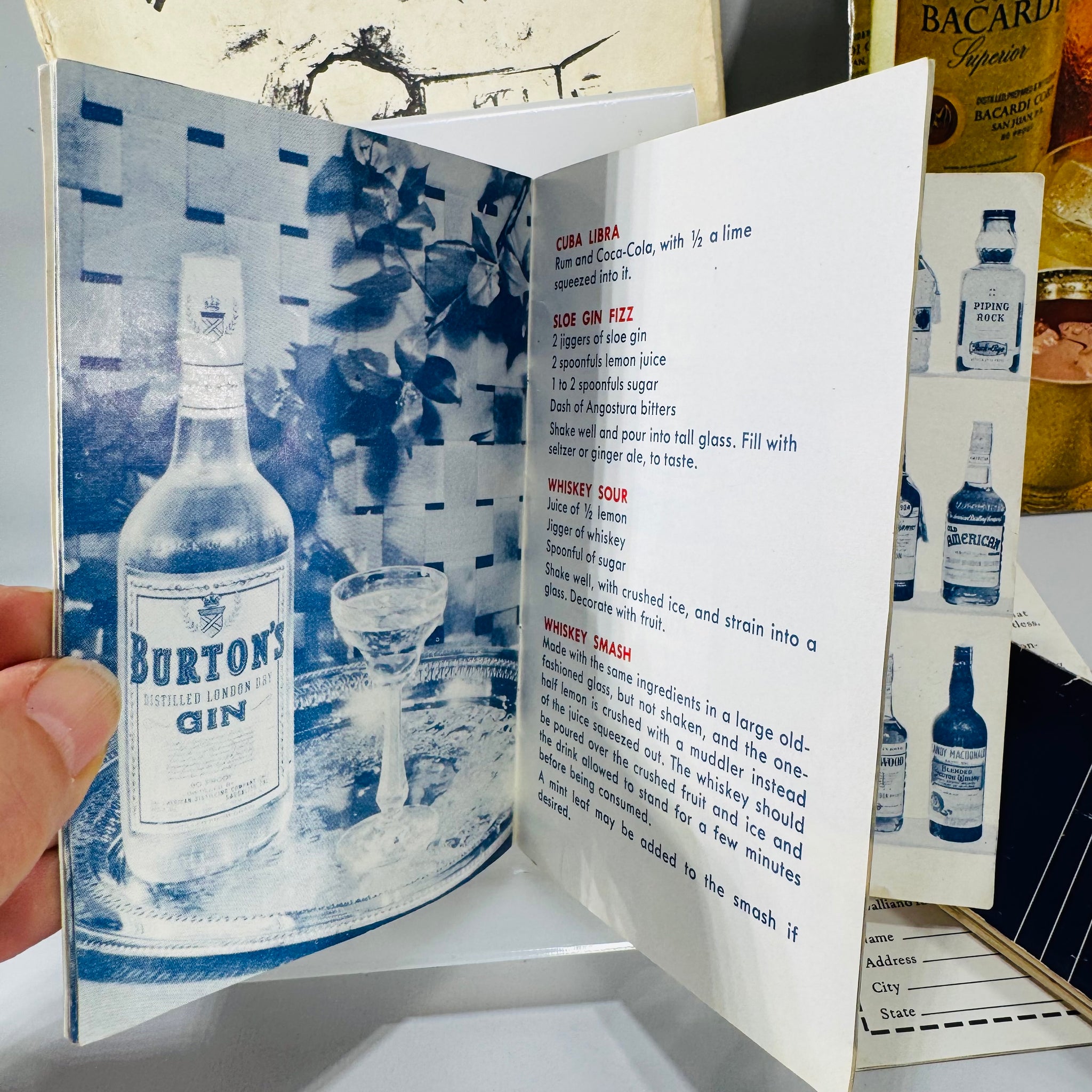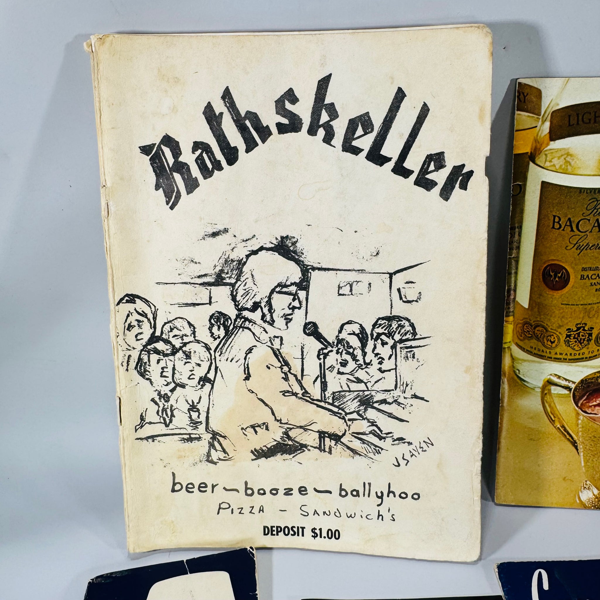 A fun, display-worthy bundle of mid-century bar booklets and cocktail ephemera, plus a Rathskeller bar song book packed with old standards. Great for cocktail lovers, collectors, prop styling, bar cart décor, or retro entertaining inspiration.