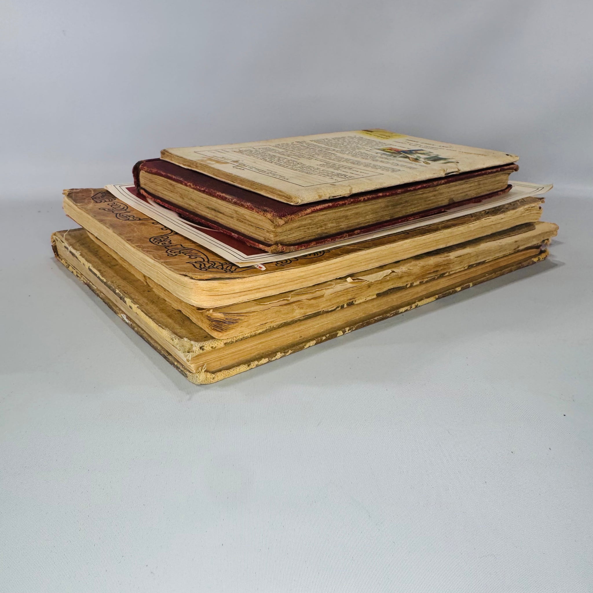 Notes: This is a well-used bundle with visible age and kitchen wear throughout: staining/soiling, tanning, edge and corner wear, creases, and handling marks.