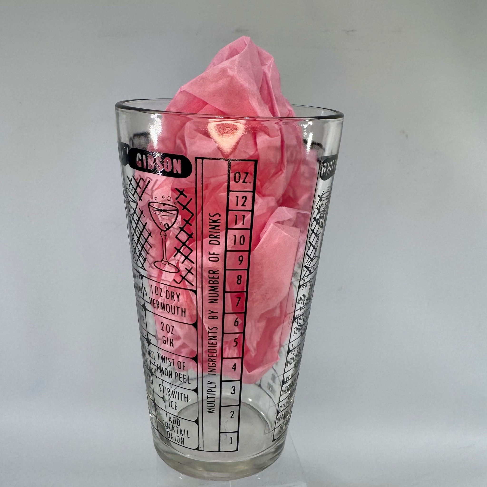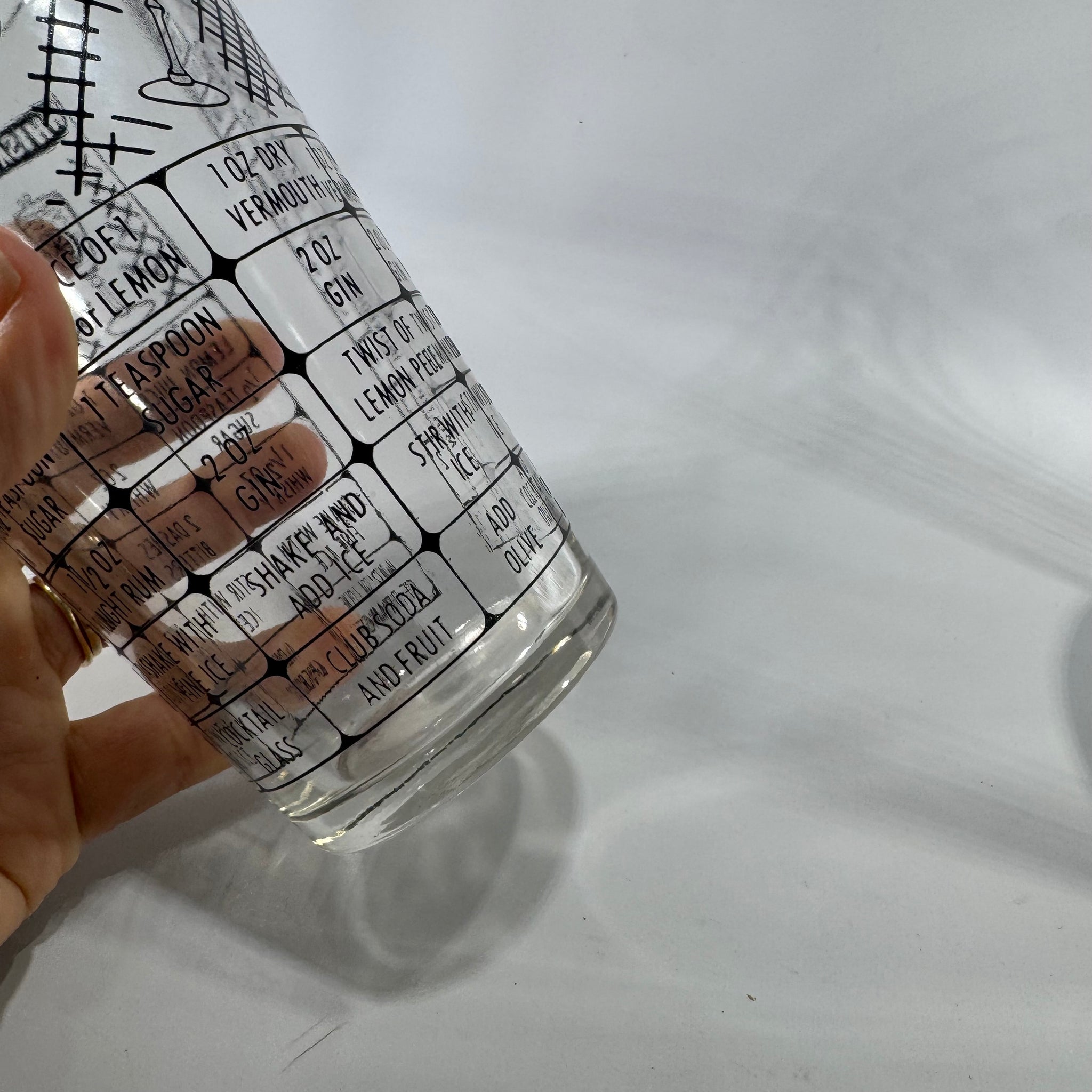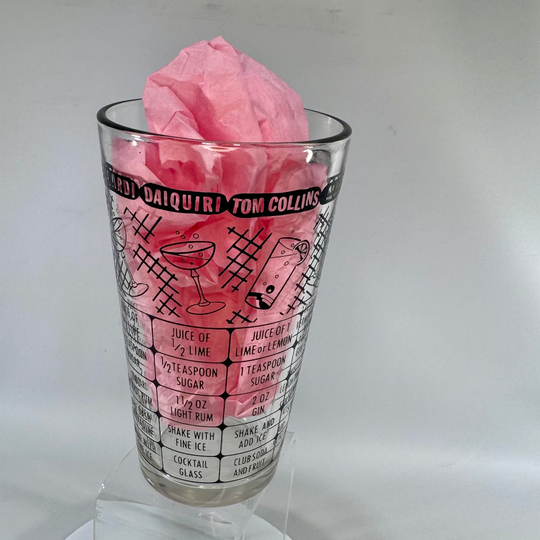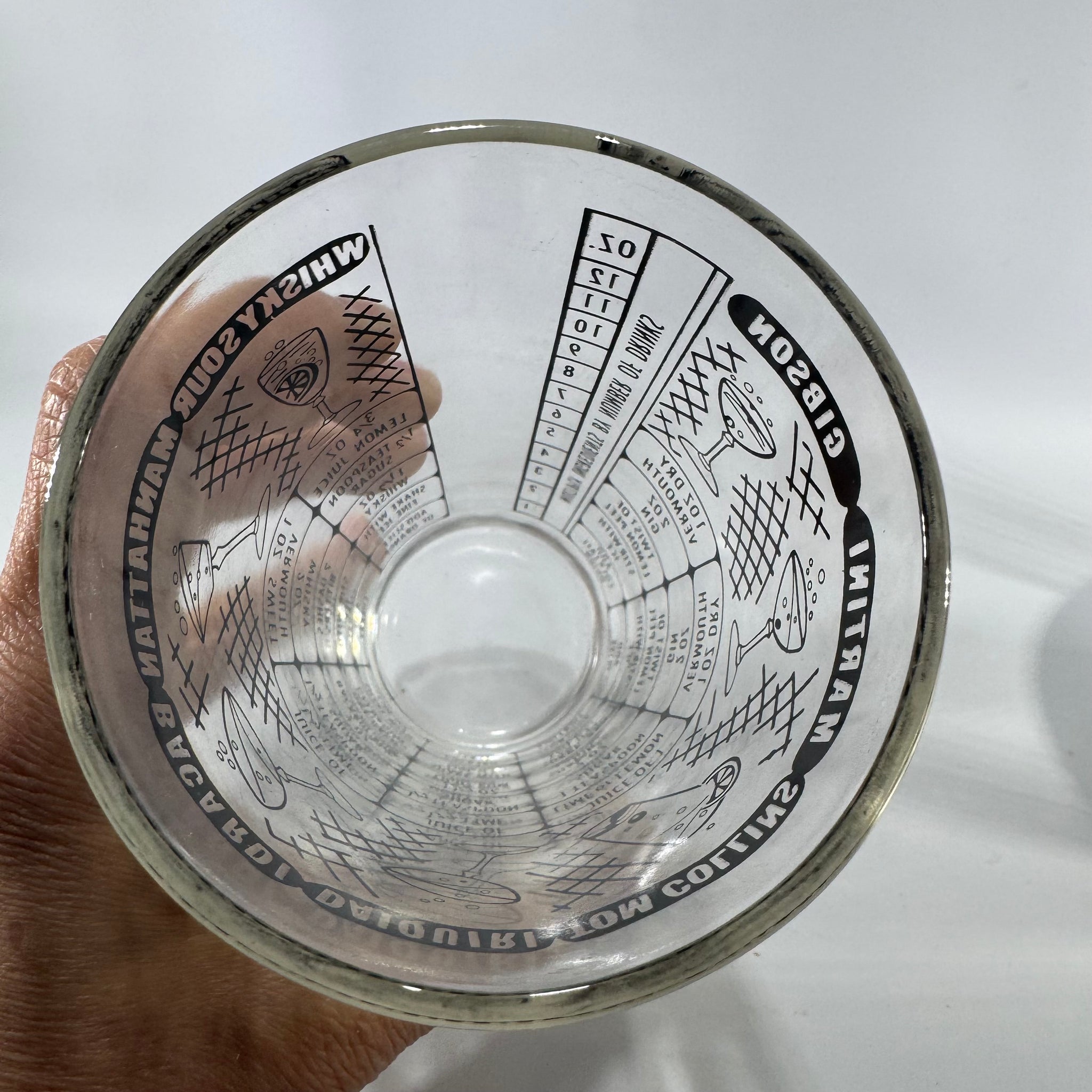 • Design: Mid-century modern cocktail recipe glass with black graphic drink icons, crosshatch pattern, and printed instructions for mixed drinks including Whisky Sour, Manhattan, Bacardi, Daiquiri, Tom Collins, Martini, and Gibson