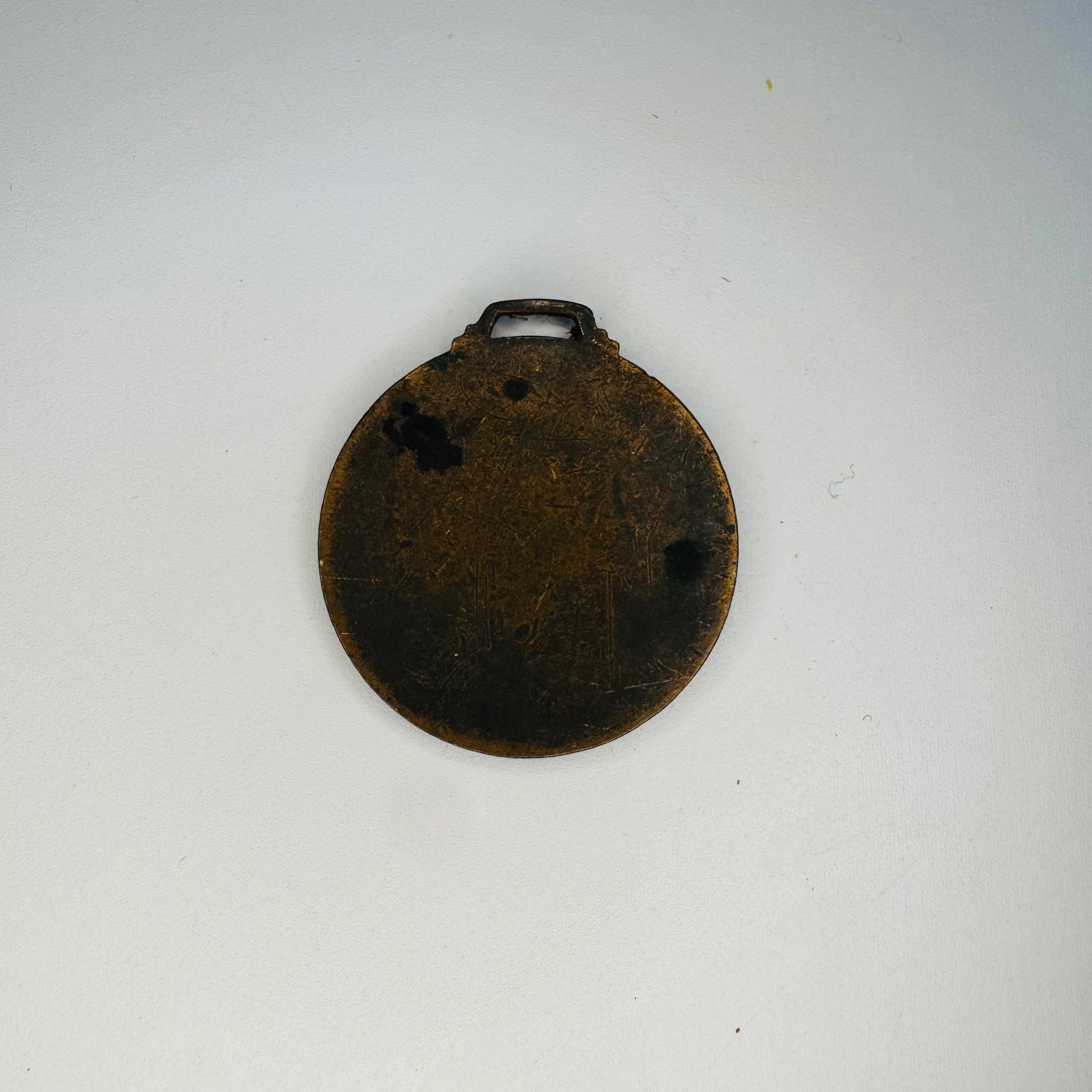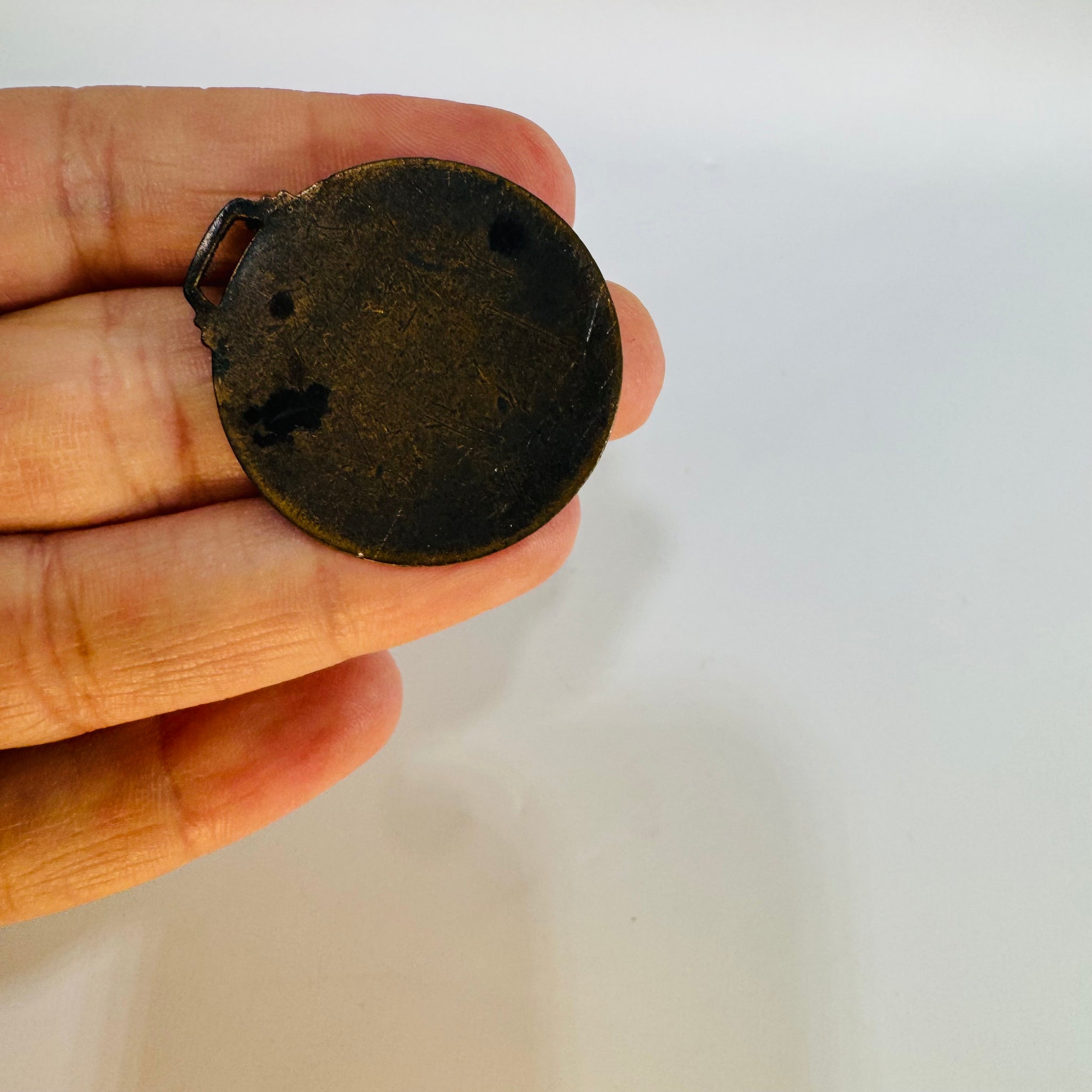 • Material: Metal medallion with colored enamel-style front details; exact metal type not confirmed from photos