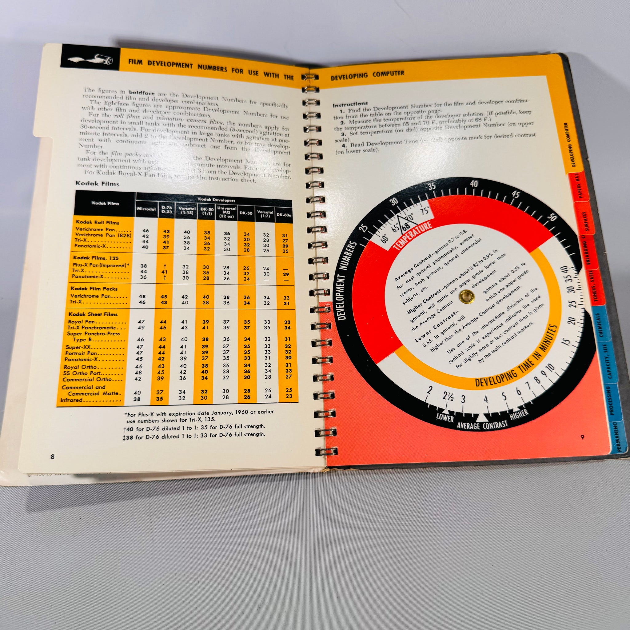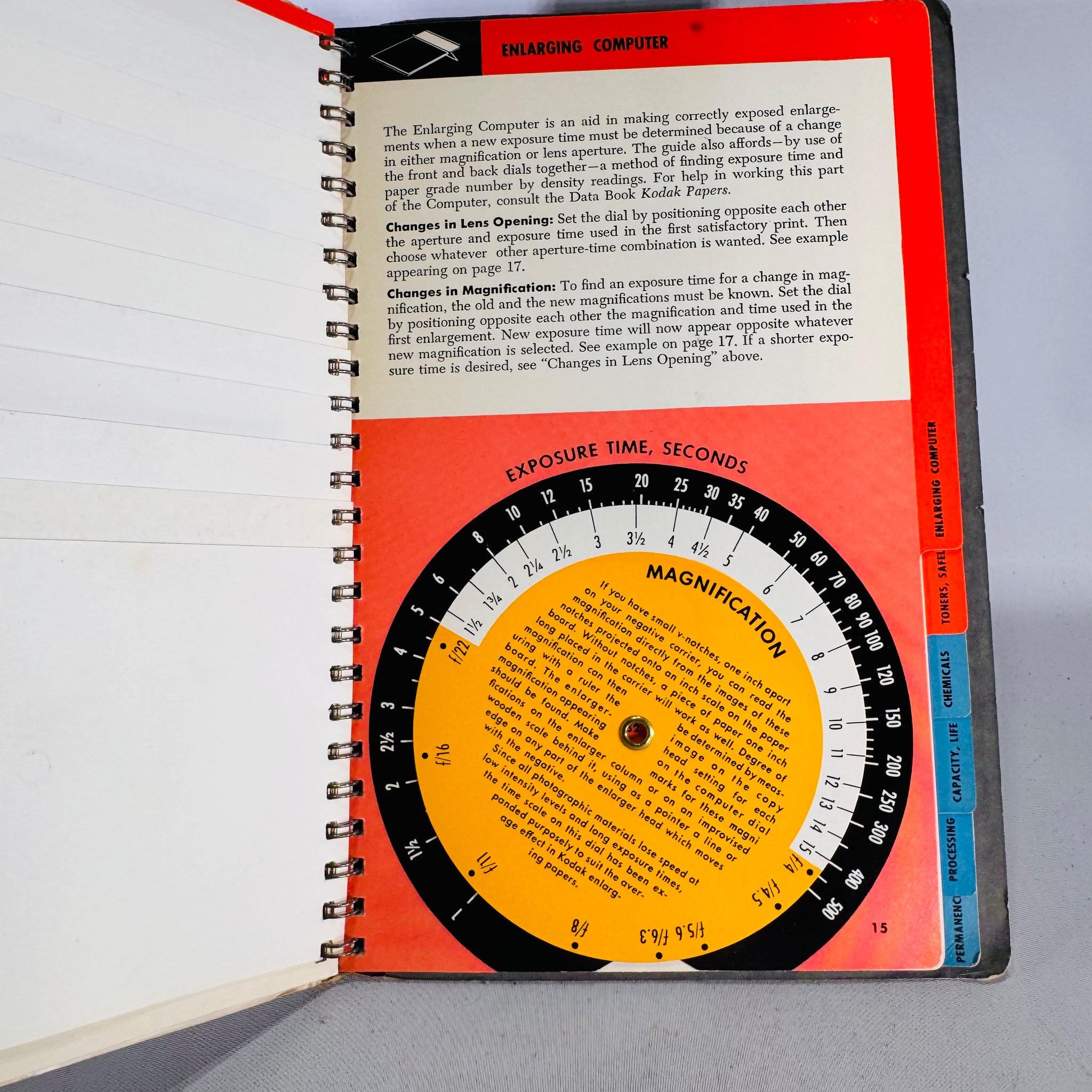This is Kodak’s classic Master Darkroom Dataguide from 1958, the pocketable reference that lived beside enlargers for decades. It packs exposure indexes, developer times, paper grades, and toners into easy color-coded charts.