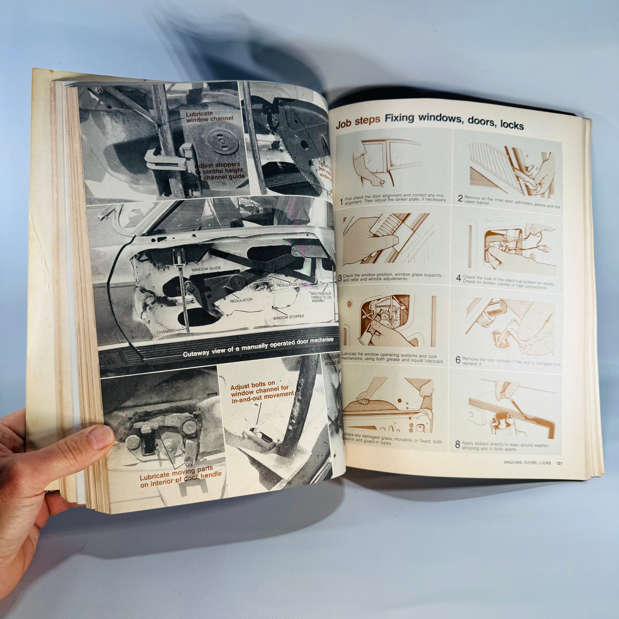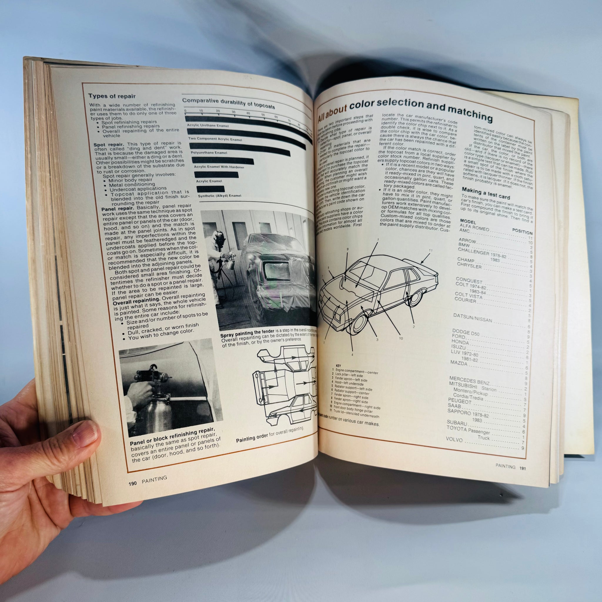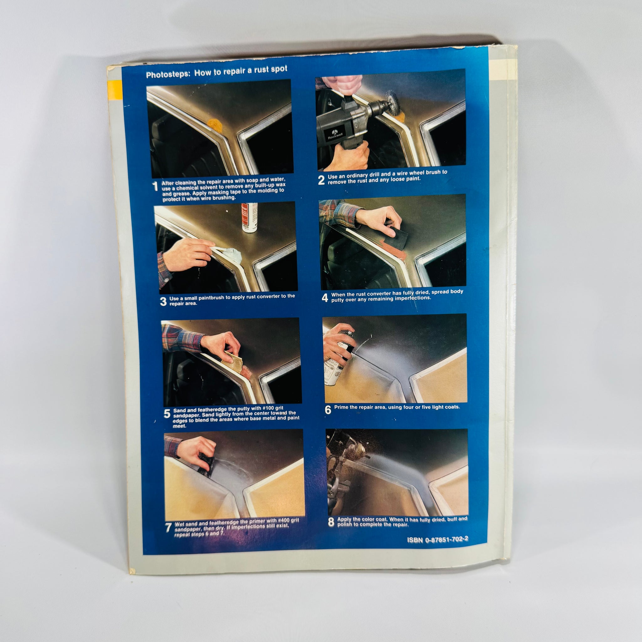 It covers practical skills like spray painting basics, surface prep, repairing dents, fixing chips and nicks, and working with body fillers. You also get photo-heavy walkthroughs and illustrated job steps for common problems (including rust-spot repair and door/window/lock fixes).